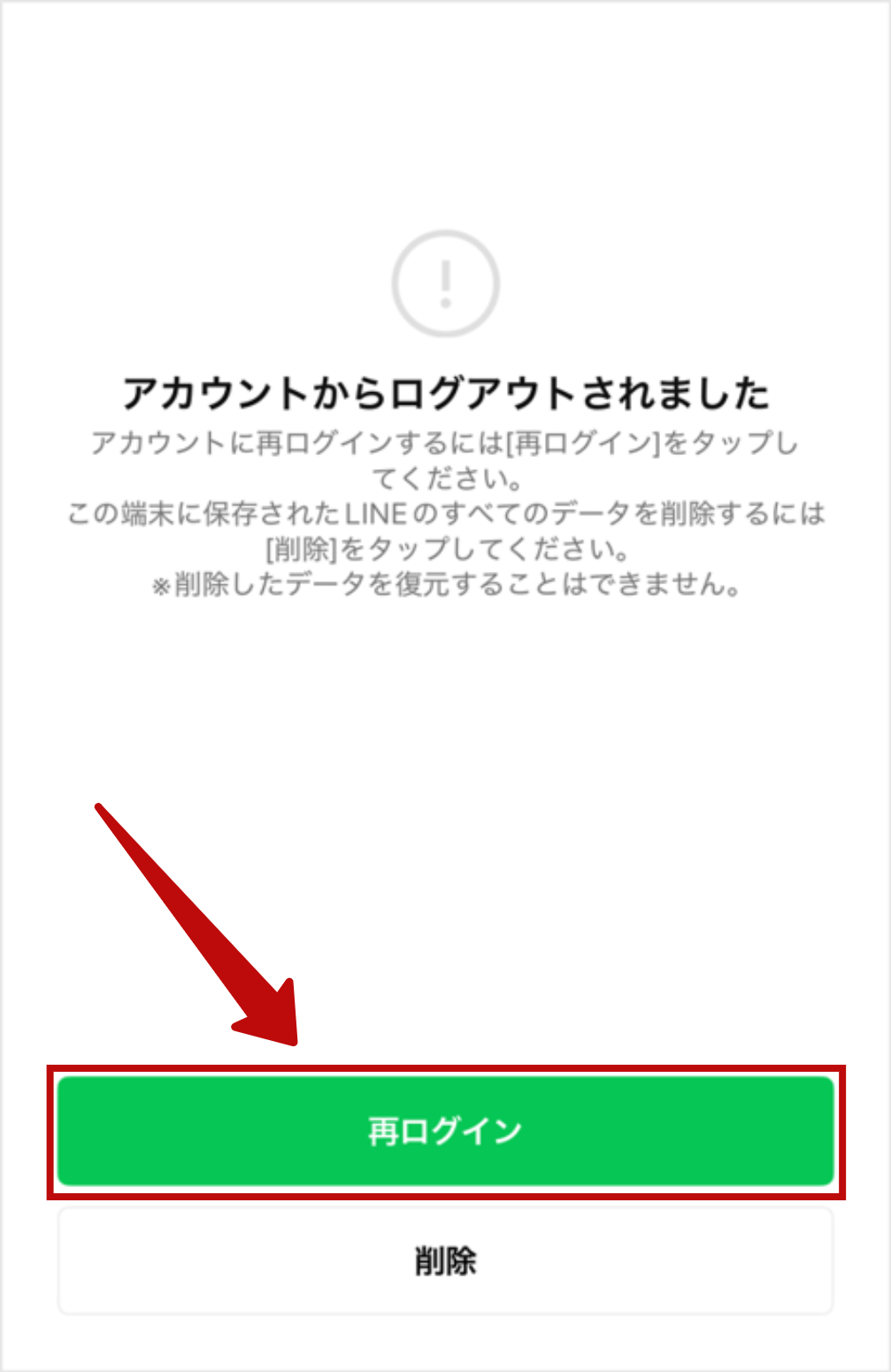 「アカウントからログアウトされました」と表示されている再ログイン画面で、第三者の指示通りに削除をタップすると、その端末に保存されているLINEの全てのデータが削除されてしまいます。