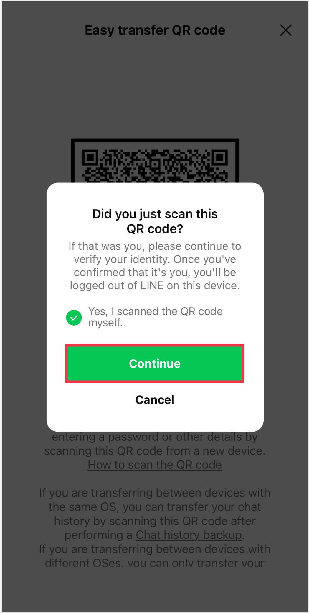 If you were the one who scanned it, check Yes, I scanned the QR code myself, then tap Continue.