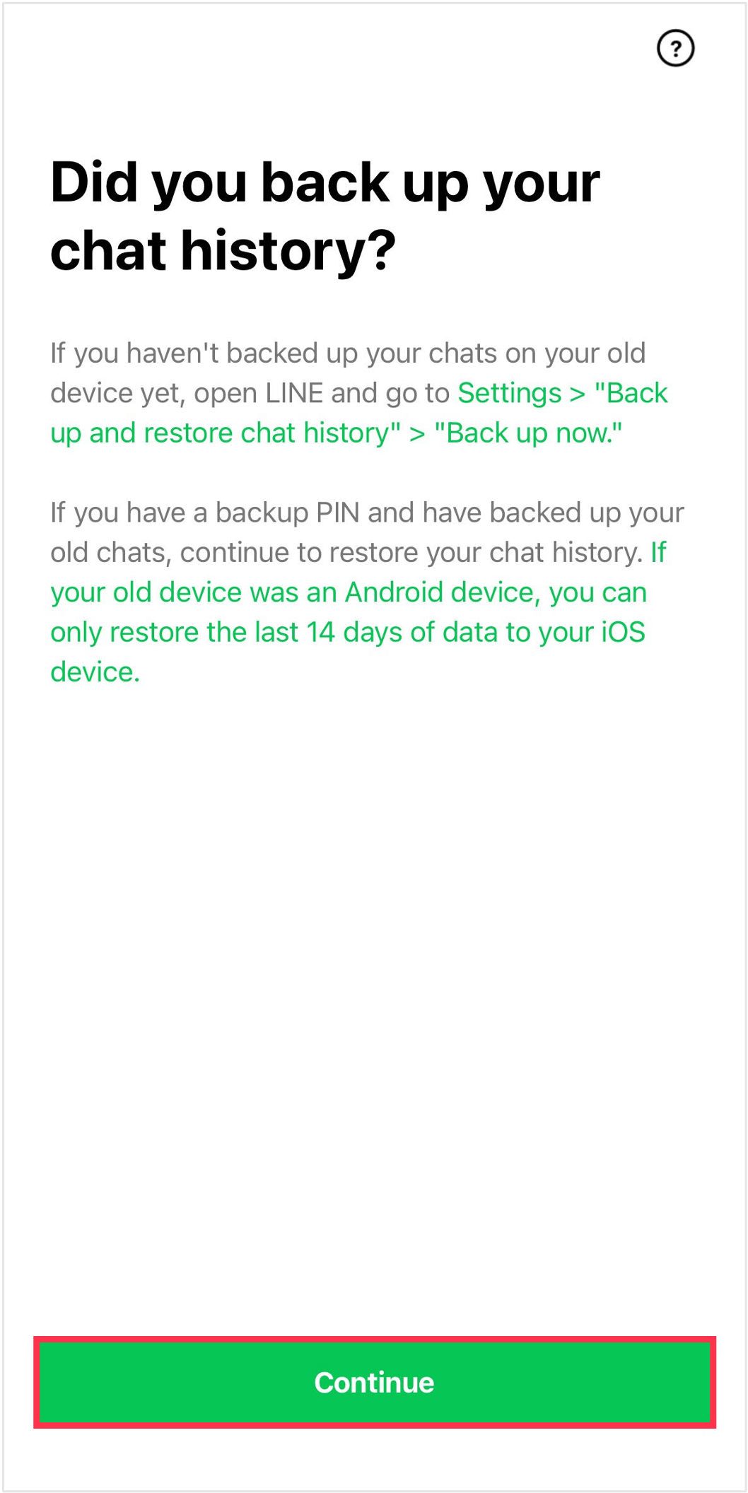 Please be aware that once you tap Continue, LINE will become unavailable on your previous