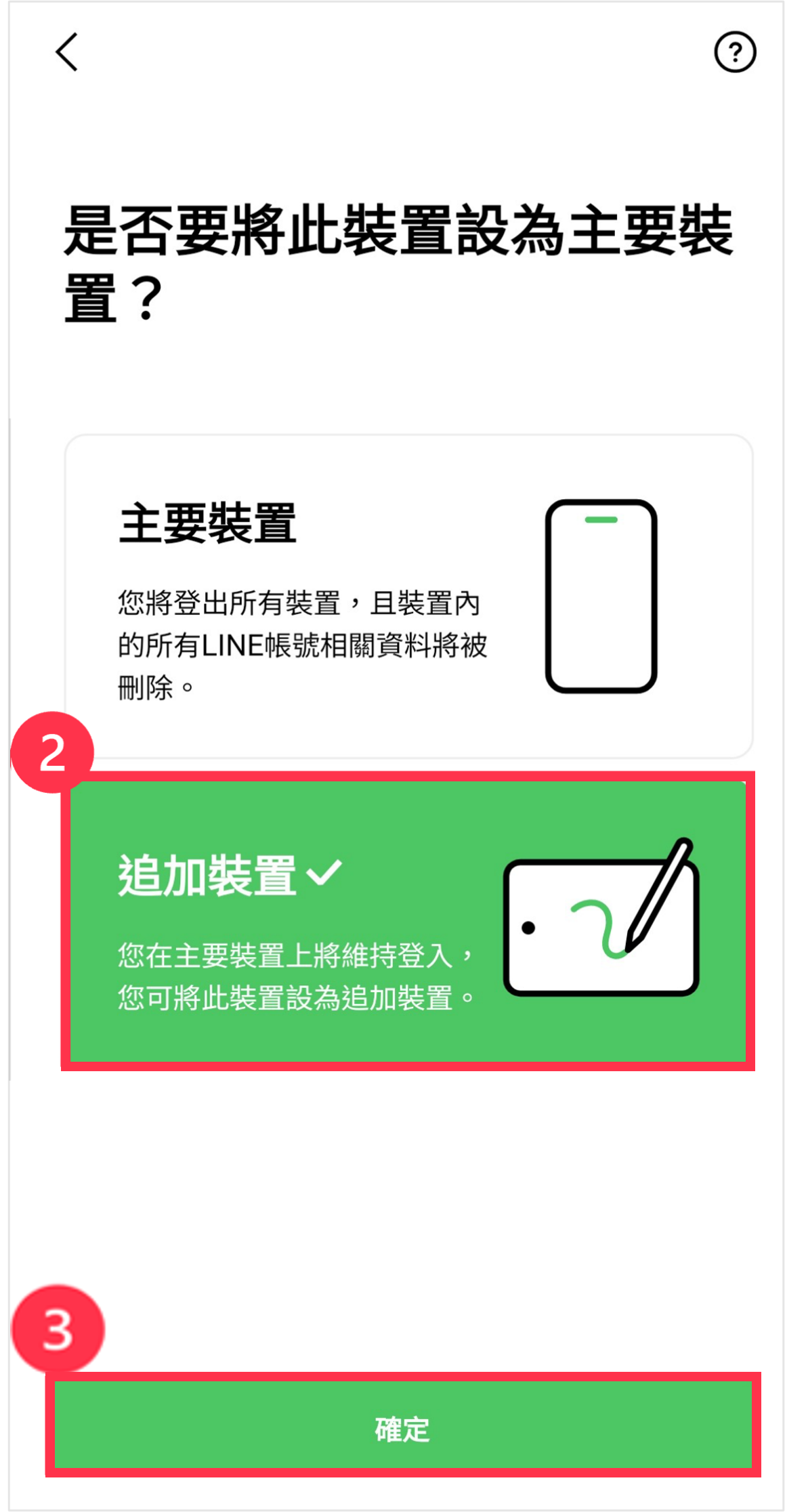 ※首次於追加裝置上登入LINE帳號時,系統可能會要求在主要裝置上輸入認證碼。